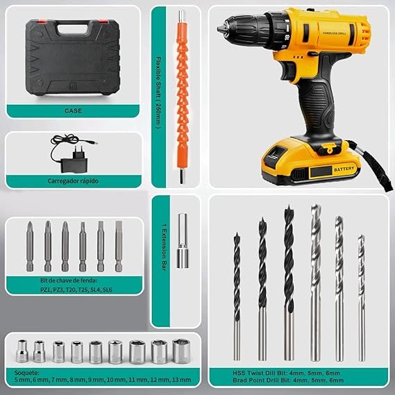 Inclui furadeira, duas baterias, carregador, brocas e bits, tudo organizado em uma maleta resistente. Fácil de transportar e guardar.