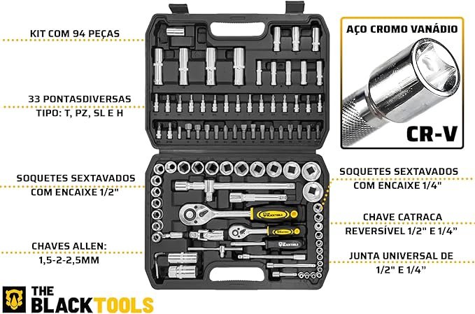 Jogo de Ferramentas 94 Peças The Black Tools TKF94 – Soquetes, Chaves e Bits – Encaixe 1/4″ e 1/2″ – Aço Cromo Vanádio