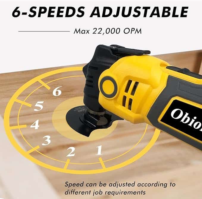 | Componentes incluídos | 1 almofada de lixa, papel de areia, 12, cabeça escareada de aço HCS, 1 lâmina de serra HCS, 1 raspador de aço inoxidável, 2 lâminas de serra de madeira, Obiokay 1 ferramenta elétrica oscilante |