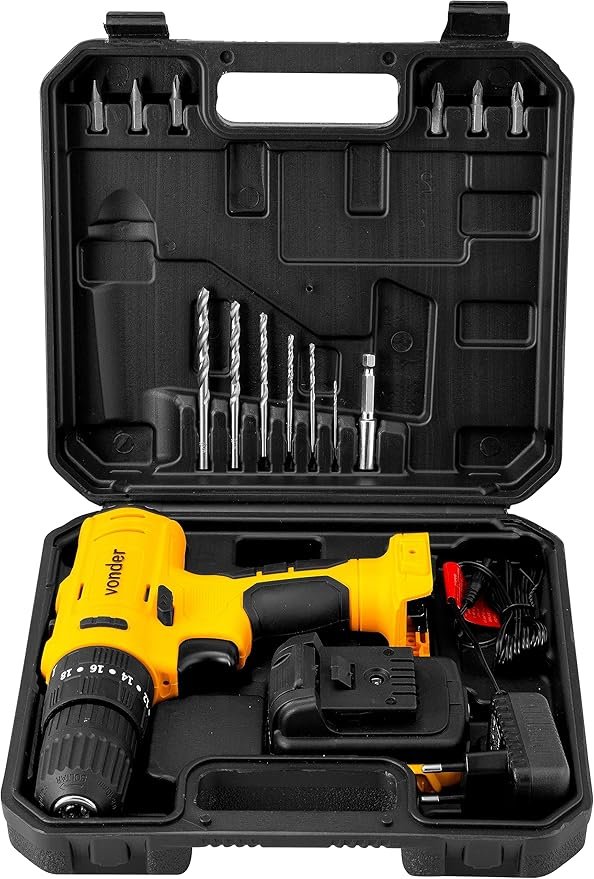 | Componentes incluídos | 1 Parafusadeira/furadeira. Acompanha: 1 maleta plástica, 1 bateria 12 V – 1,3 Ah, 1 fonte de alimentação, 6 brocas (1,5 MM, 2,5 MM, 3 MM, 4 MM, 5 MM, 6 MM), 6 BITS (FENDA 5 MM E 6 MM, PZ1, PZ2, PH1, PH2) E 1 PROLONGADOR 60 MM. |