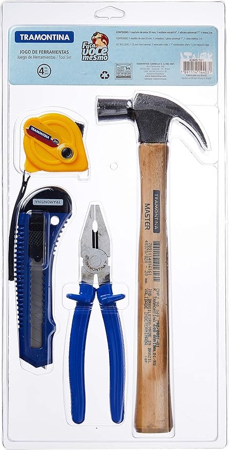 Tramontina 43409101, Kit de Ferramentas 4 Peças Contem 1 Martelo, 1 Estilete, 1 Alicate, 1 Trena