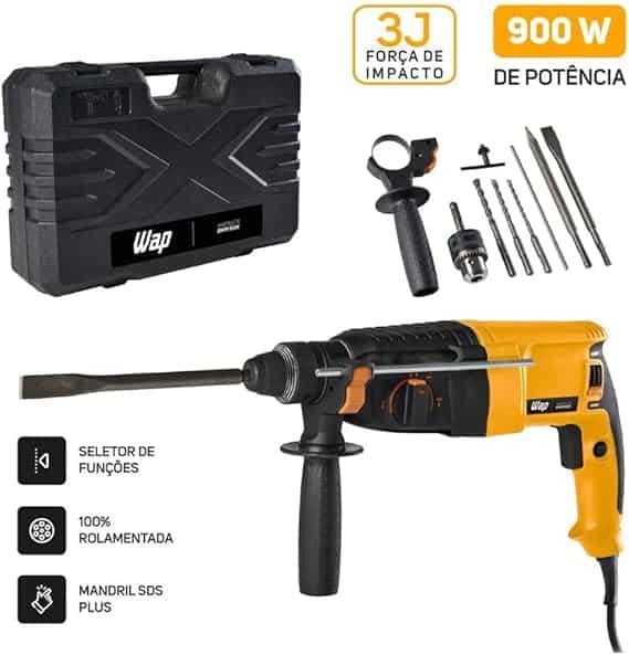 Possui motor com 900 W de potência, 100% rolamentada com até 5500 número de impactos. É uma ferramenta que pode executar tarefas pesadas, possuindo 35 Nm de Torque, o que auxilia na perfuração materiais duros. Também acompanha 1 chave de aperto para o mandril, 3 brocas para concreto Ø 6, 8, 10 mm, 1 ponteira hexagonal, 1 talhadeira, e mandril com adaptador, todos inclusos com uma maleta para o trabalho esteja sempre organizado.